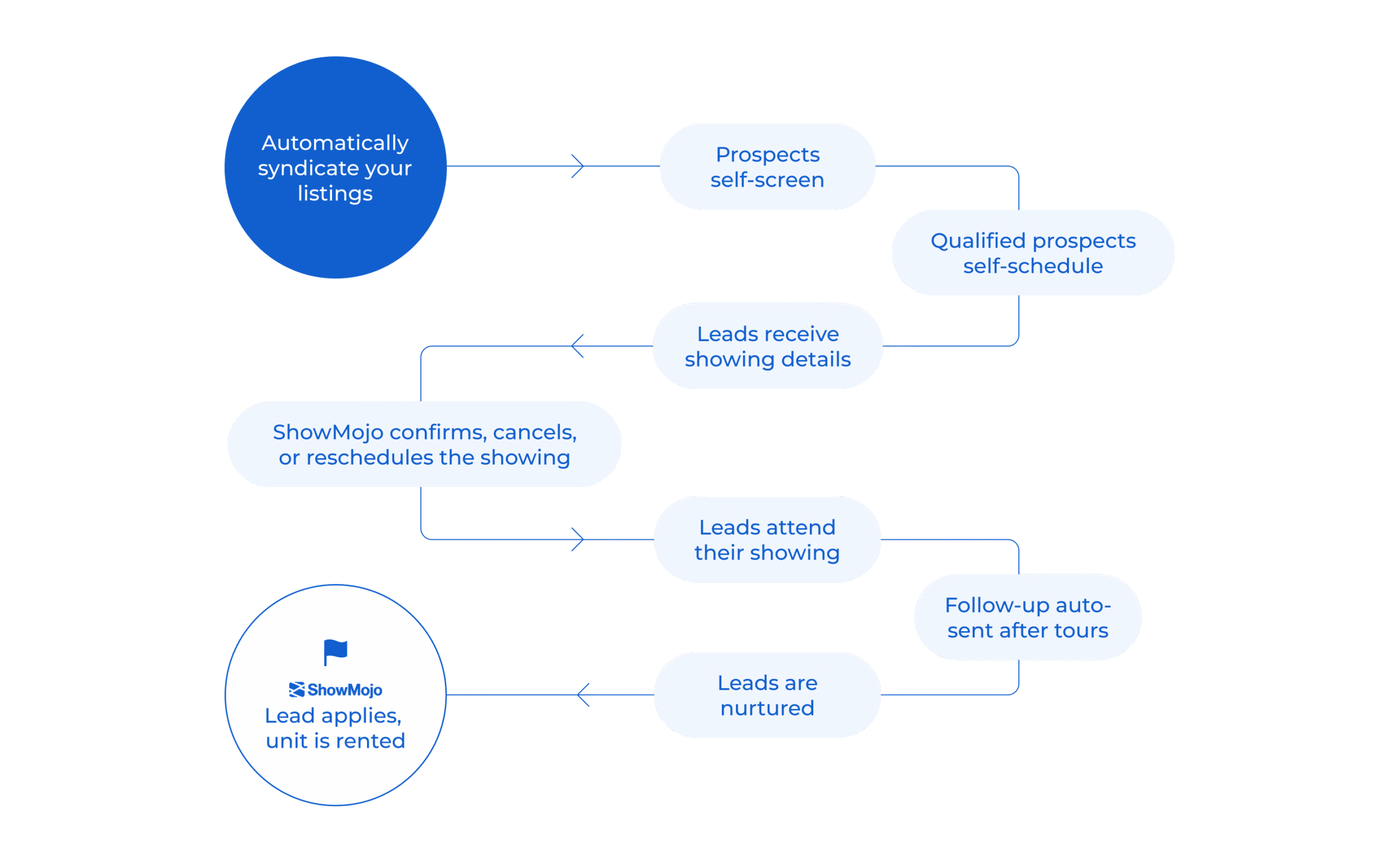 A flow chart with arrows connecting one item to another illustrating the process from start to finish: Automatically sindicate your listings, Prospects self-screen, Qualified prospects self-schedule, Leads receive showing details, ShowMoj confirms, cancels or reschedules the showing, Leads attend their showing, Follow-up auto-sent after tours, Leads are nurtured, Lead applies, unit is rented