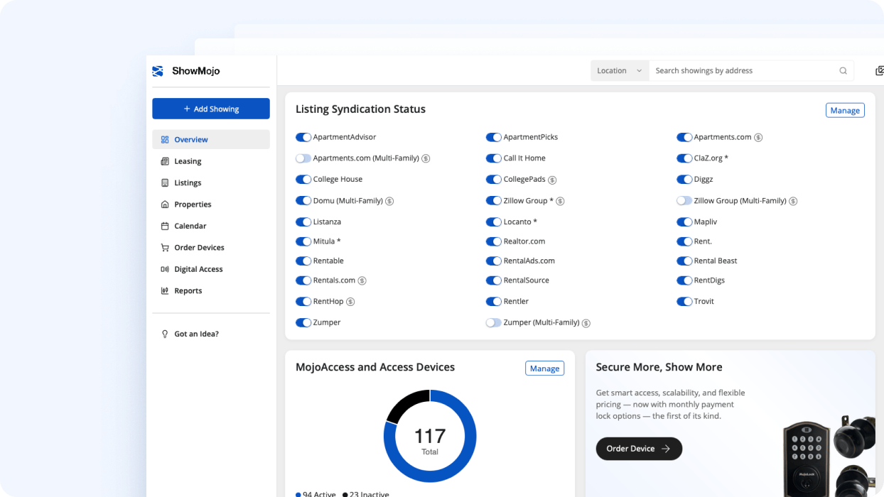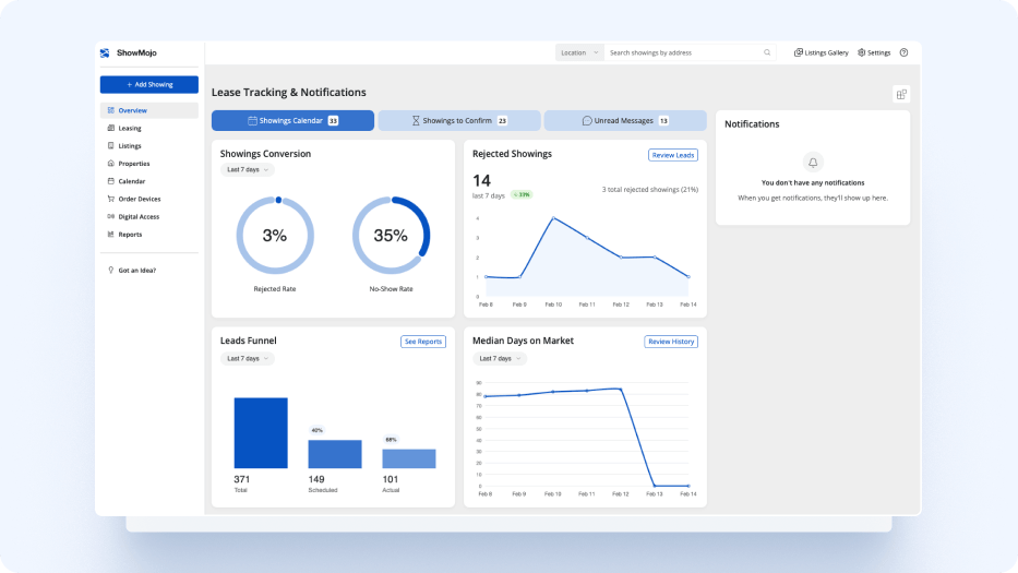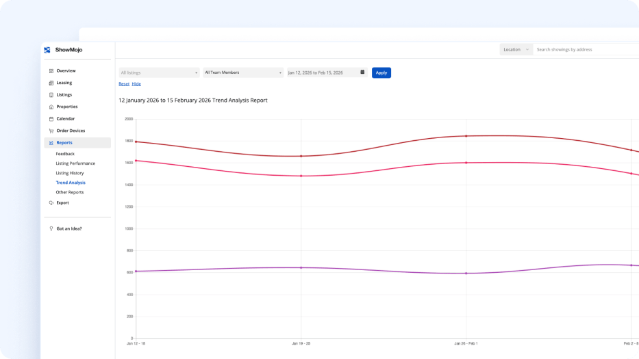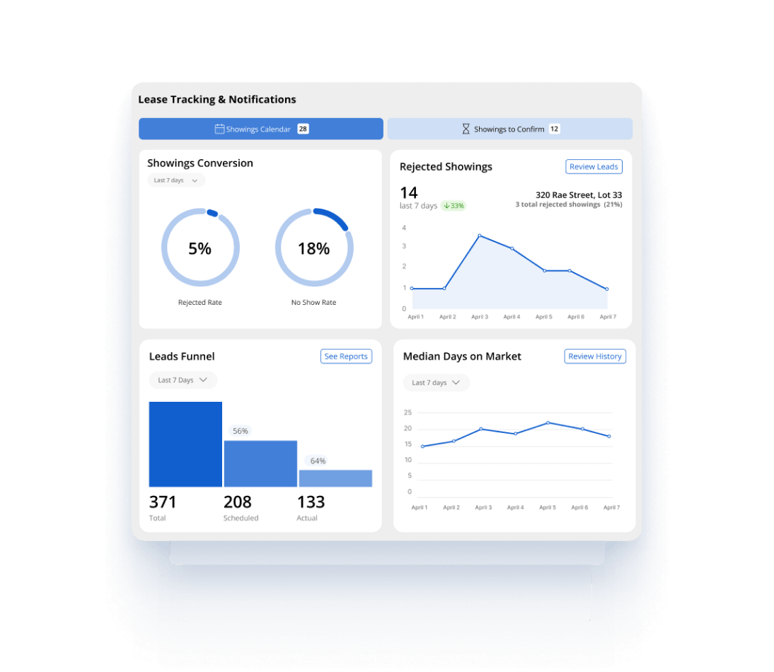 Track leads, showings, conversions, trends, and owner-ready results from one reporting hub. See performance by property, portfolio, source, and timeframe.